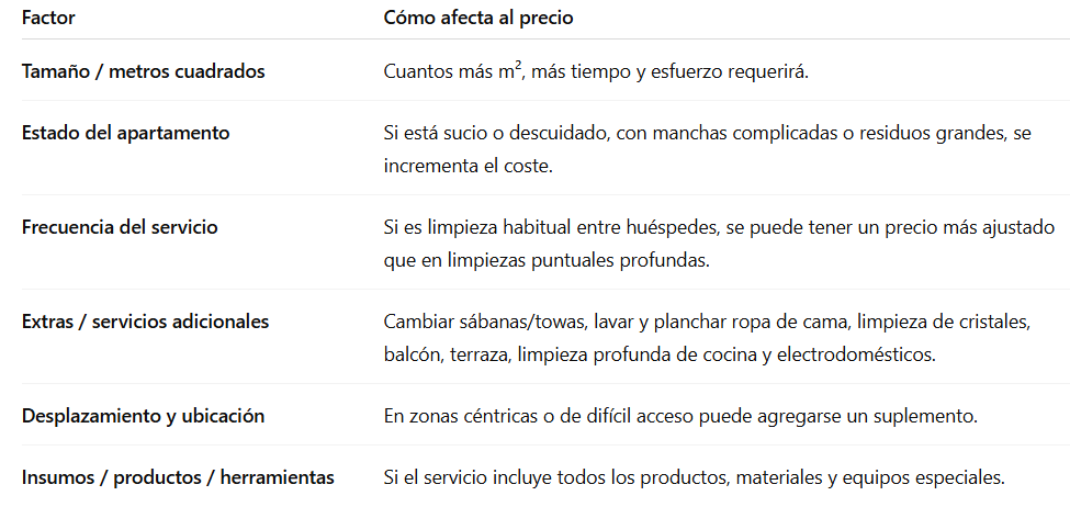 El coste de limpiar un apartamento turístico no es fijo; depende de varios elementos: