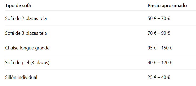 👉 Como referencia, muchas empresas cobran 25 € - 30 € por plaza de sofá, ajustando el precio según el material y la dificultad de la limpieza.
